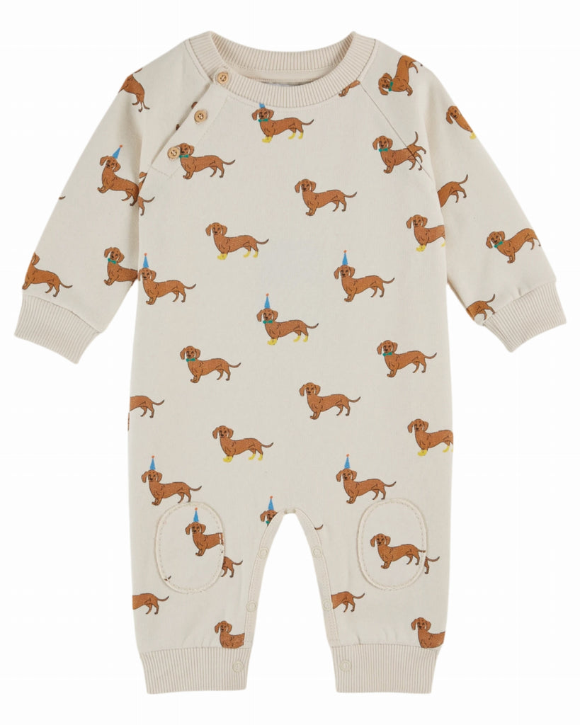 Combinaison en jersey de coton biologique molletonné et gratté écru imprimé de teckels caramel à bottes jaunes, nœuds papillon verts et chapeaux pointus bleus. C'est la fête chez les teckels !