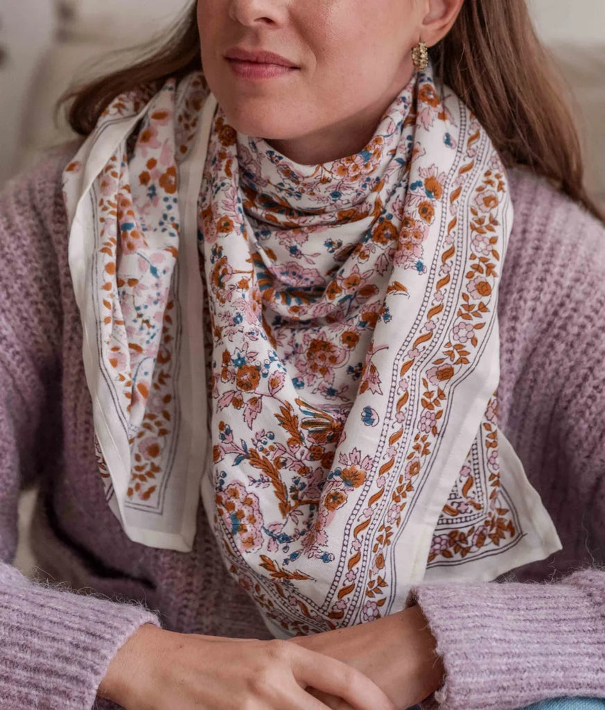 Un carré coloré et imprimé à la main sur un tissu doux et léger, qui enveloppera votre cou pour un petit look boho-chic! À porter autour du cou, dans les cheveux ou en ceinture.